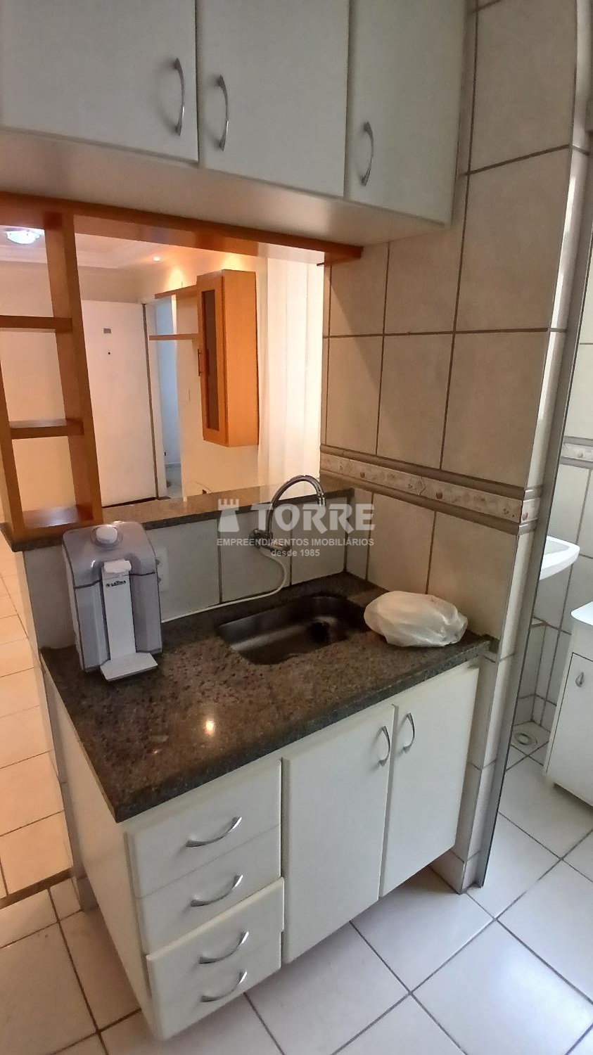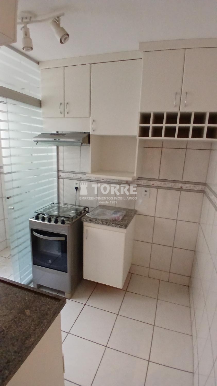 Sala, com rack e cortinas, cozinha com armários, fogão, exaustor, purificador de água, 02 dormitórios com armários e 01 vaga de garagem.