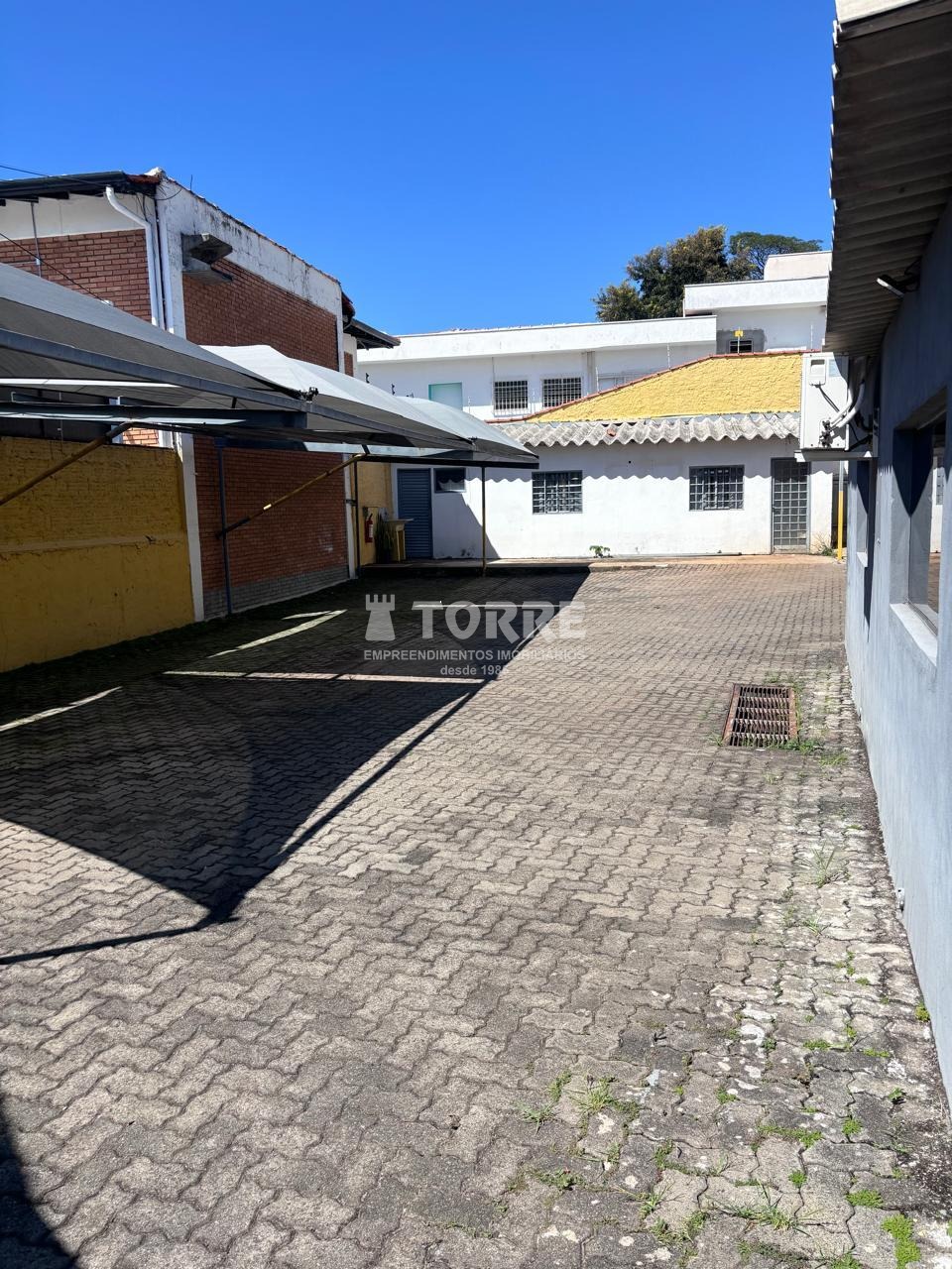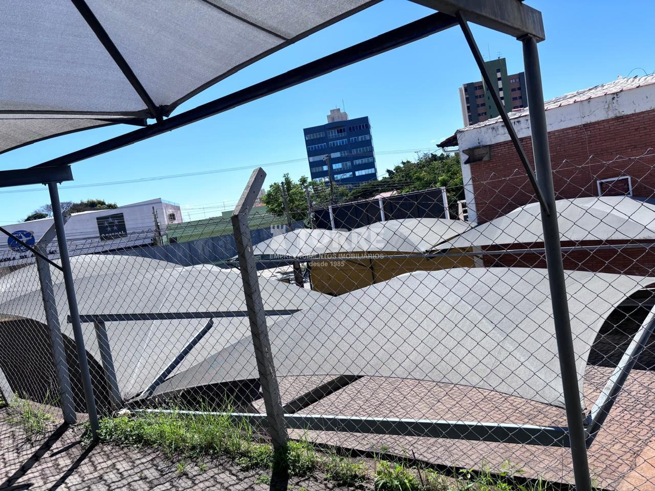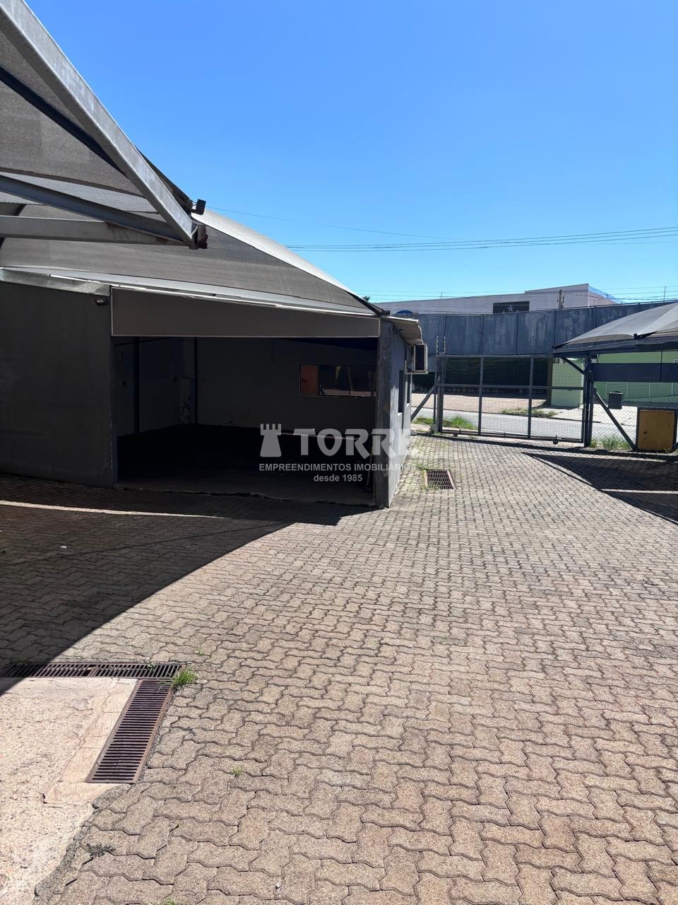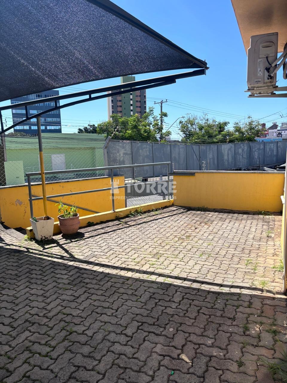 Pátio revestido com piso de concreto, sombreadores e escritório coberto e fechado com ar condicionado.