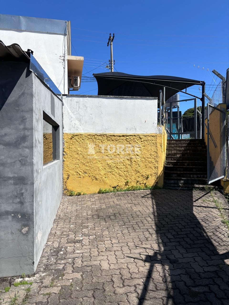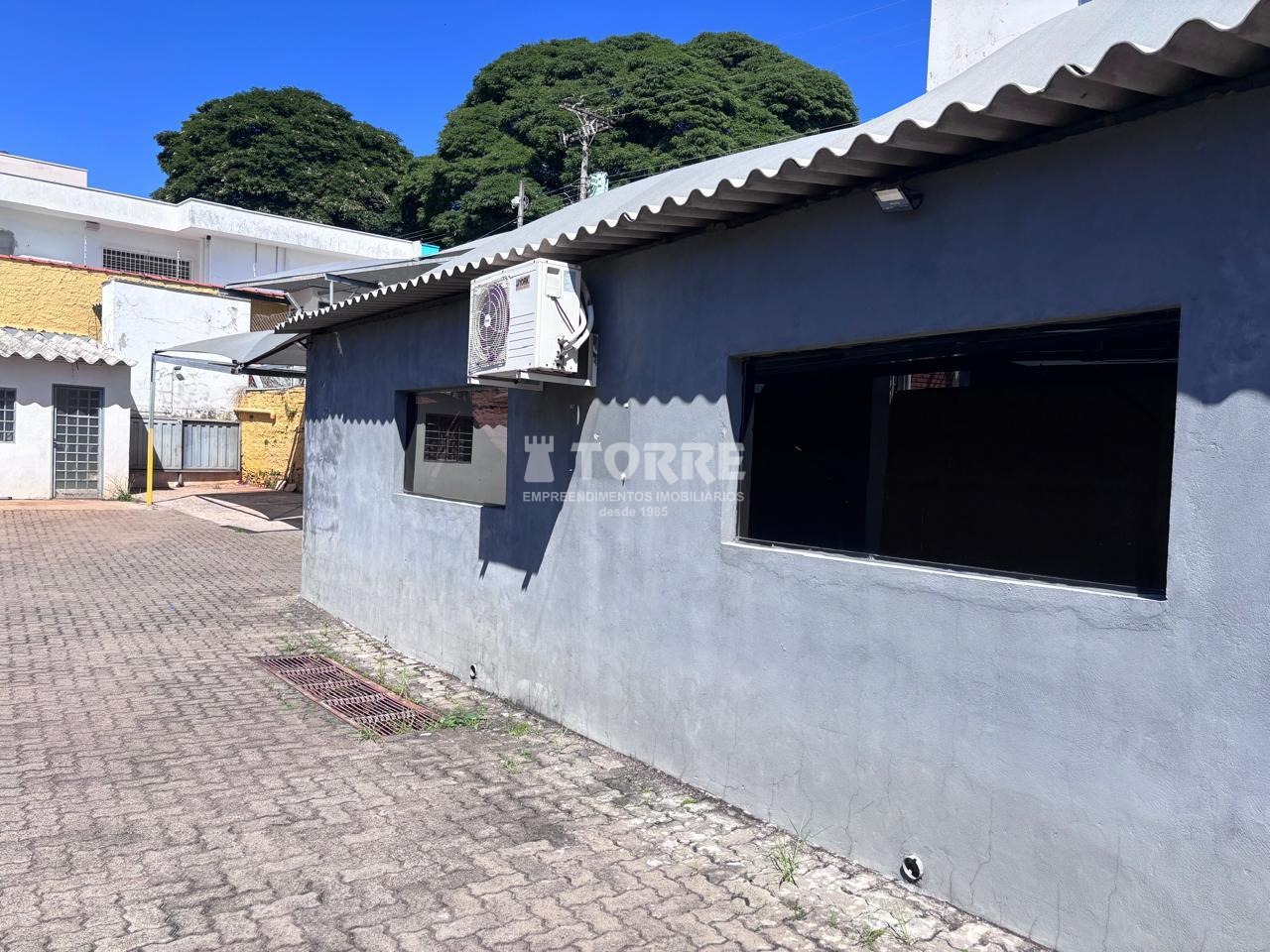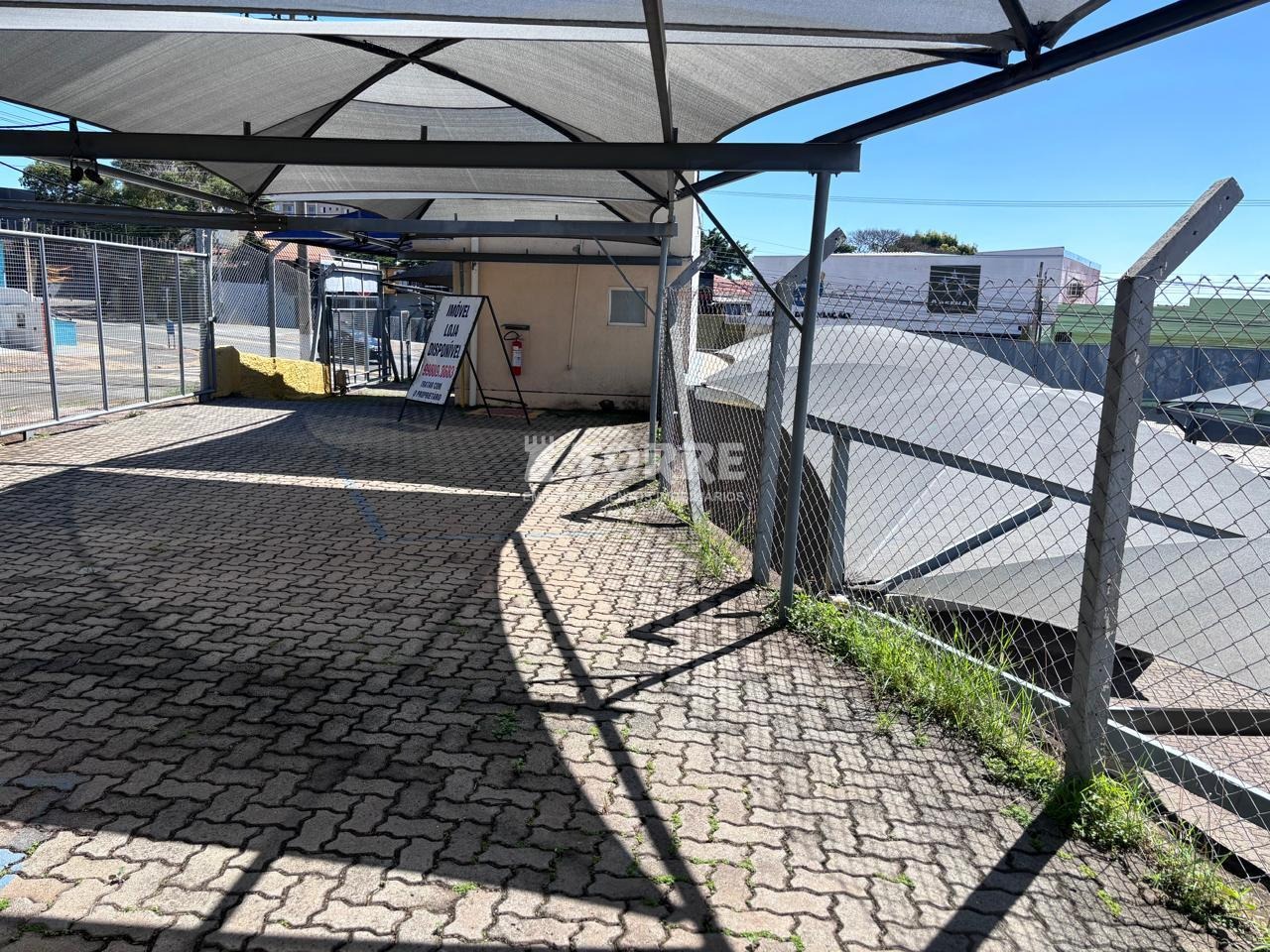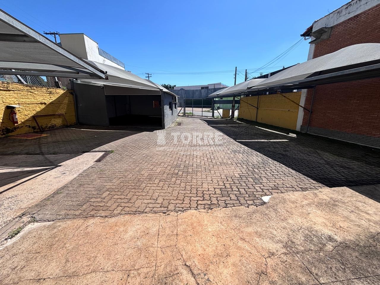 Pátio revestido com piso de concreto, sombreadores e escritório coberto e fechado com ar condicionado.